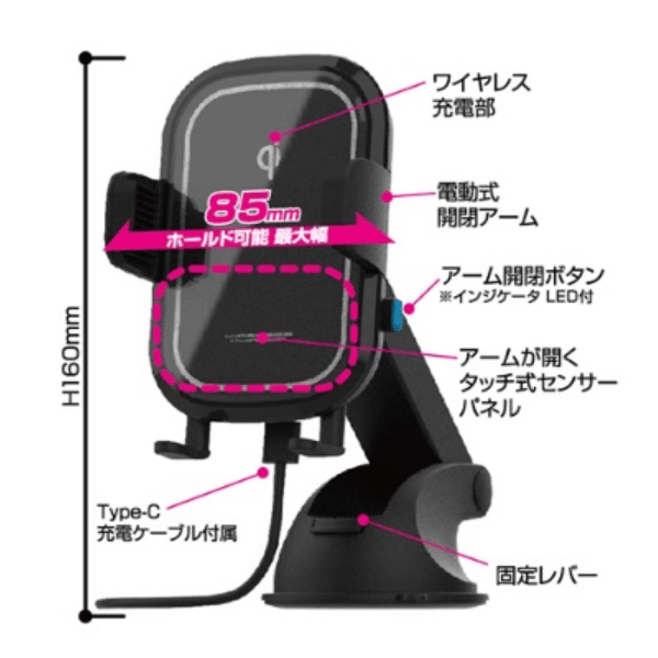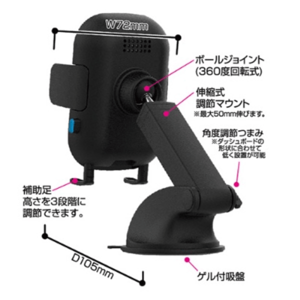 ■付属品 USB-A-Type-C USB充電ケーブル(コード長:約1.1m)/取付用プレート(両面テープ付) 品番:KW-23 JANコード:4907986330236 ワイヤレス規格:Qi 入力:5V / 9V / 12V USB Type-C 出力:最大15W 使用温度範囲:0~30℃ ホールド可能サイズ:幅:約62~85mm以内 厚み:20mm以内 コード長:約1.1m 本体サイズ/重量:72Wx160Hx105Dmm / 250g パッケージサイズ:140Wx180Hx72Dmm パッケージ重量:325g メーカー希望小売価格:オープン