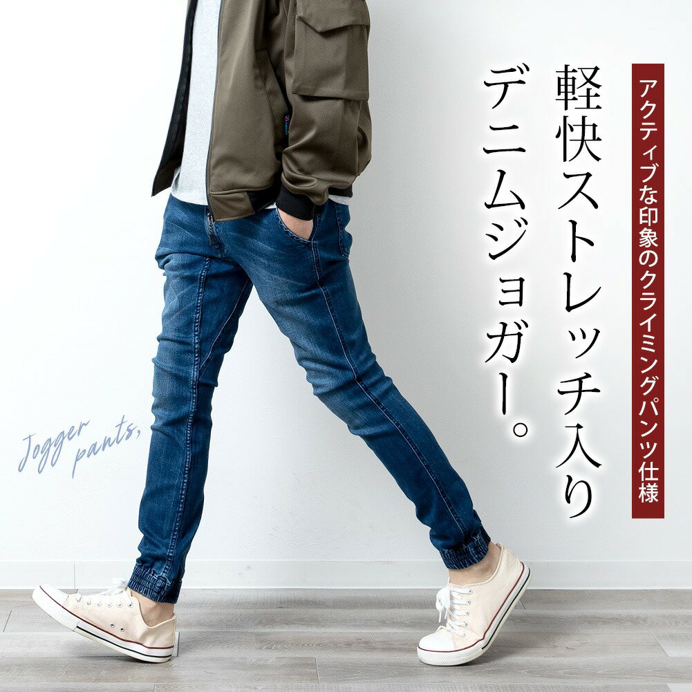 ジョガーパンツ メンズ デニム ストレッチ クライミングパンツ リブパンツ デニムパンツ ベルト付き イージーパンツ スリム ジーンズ 春物 シンプル 無地 インディゴ ブルー グレー 紺 全3色 M L 大きいサイズ 67031